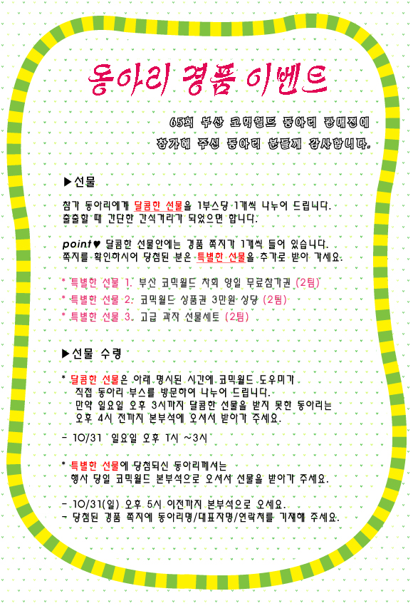 목록 65회 부산 코믹월드 - 참가 동아리 경품 이벤트(10월) 페이지 정보 작성자 코믹월드 댓글 0건 조회 2,614회 작성일 10.10.11 본문 65회 부산 코믹월드 - 참가 동아리 경품 이벤트(10월) 행사정보 코믹월드 문구전