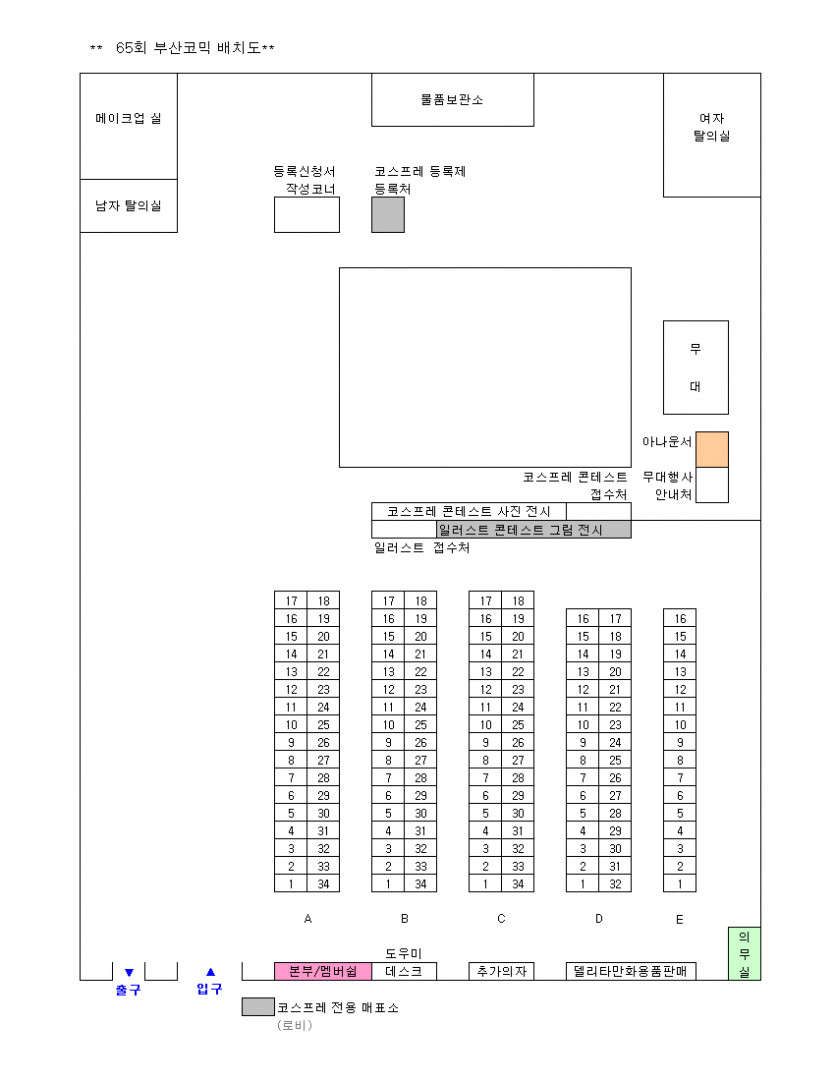목록 65회 부산 코믹월드 전시장 배치도(10월) 페이지 정보 작성자 코믹월드 댓글 0건 조회 2,468회 작성일 10.10.18 본문 ※ 65회 부산 코믹월드 전시장 배치도 아래 그림을 클릭하면 좀 더 정확하게 전시장 배치도를 볼 수 있습니다. 행사정보 코믹월드 문구전