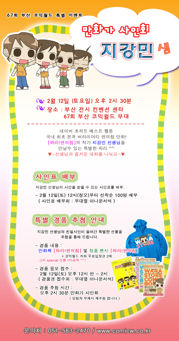 목록 67회 부산 코믹월드 만화가 사인회 (지강민 선생님 상세공지) 페이지 정보 작성자 코믹월드 댓글 0건 조회 2,057회 작성일 11.01.17 본문 * 여러분의 많은 관심과 참여 부탁드립니다. * 코믹월드님에 의해서 게시물 복사되었습니다 (2011-01-17 16:25) 행사정보 코믹월드 문구전