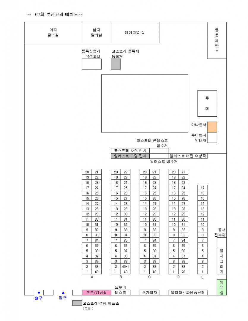 목록 <b>67회 부산 코믹월드 전시장 배치도(2월)</b> 페이지 정보 작성자 코믹월드 댓글 0건 조회 2,169회 작성일 11.01.31 본문 ※ 67회 부산 코믹월드 전시장 배치도 아래 그림을 클릭하면 좀 더 정확하게 전시장 배치도를 볼 수 있습니다. 행사정보 코믹월드 문구전