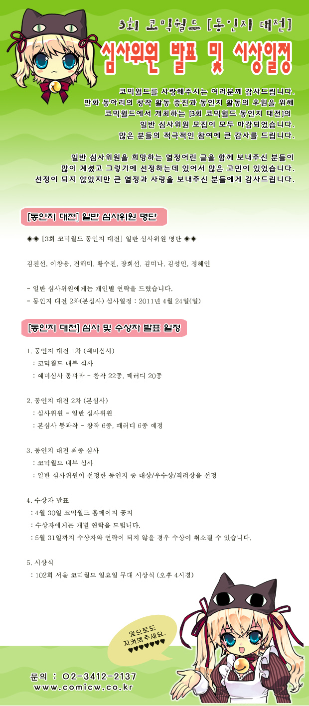 목록 3회 [코믹월드 동인지 대전] 일반 심사위원 발표 및 시상일정 페이지 정보 작성자 코믹월드 댓글 0건 조회 2,365회 작성일 11.04.22 본문 여러분의 관심과 격려 부탁드립니다. 행사정보 코믹월드 문구전