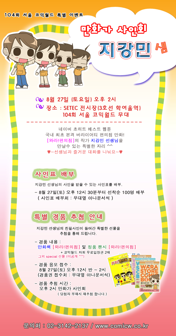 목록 104회 서울 코믹월드 만화가사인회(지강민 님) - 상세공지 페이지 정보 작성자 코믹월드 댓글 0건 조회 2,799회 작성일 11.08.18 본문 * 여러분의 많은 관심과 참가 부탁드립니다. 행사정보 코믹월드 문구전