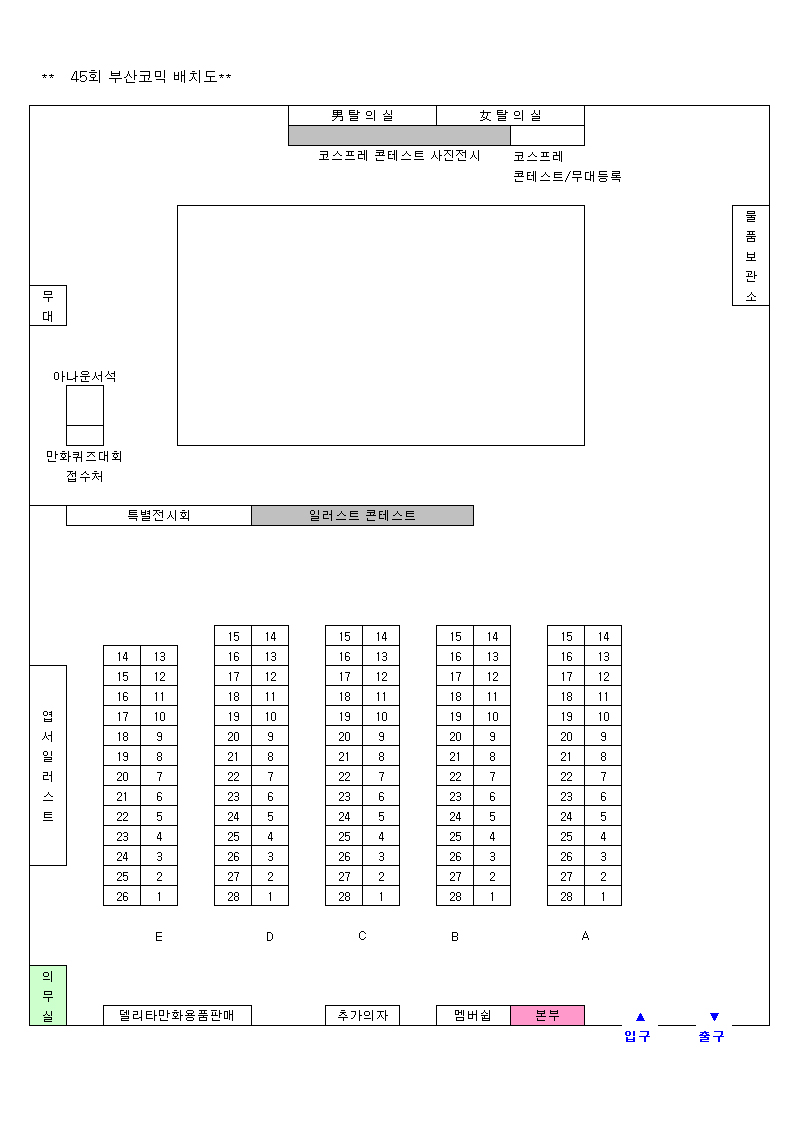 목록 45회 부산 코믹월드 전시장 배치도(12월) 페이지 정보 작성자 코믹월드 댓글 0건 조회 3,277회 작성일 07.11.26 본문 ※ 45회 부산 코믹월드 전시장 배치도 아래 그림을 클릭하면 좀 더 정확하게 전시장 배치도를 볼 수 있습니다. 행사정보 코믹월드 문구전