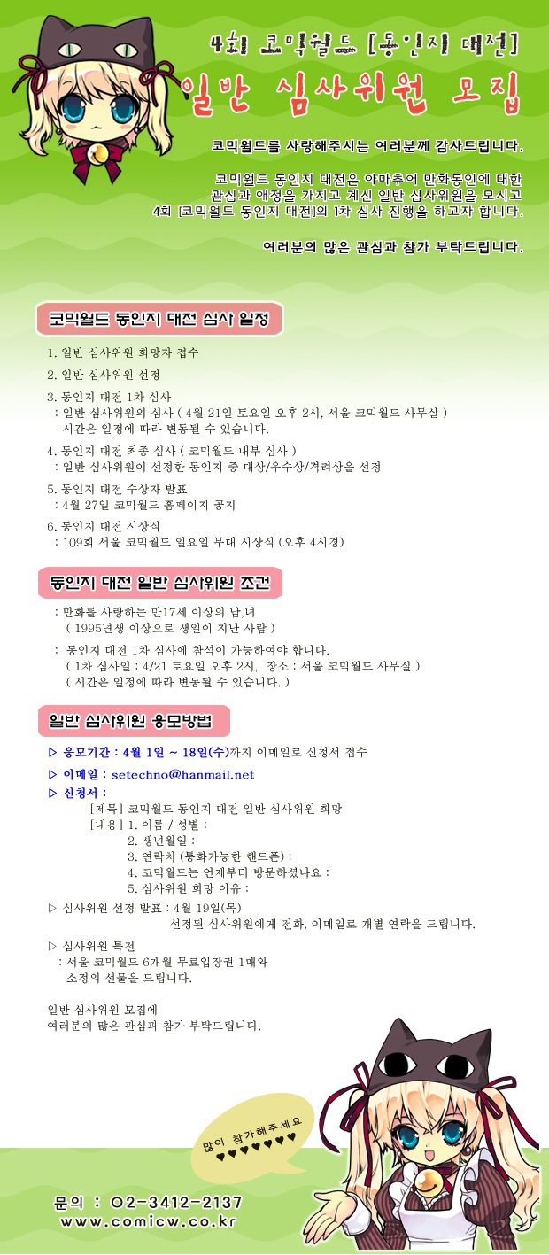 목록 4회 [코믹월드 동인지 대전] 일반 심사위원(00명) 모집 페이지 정보 작성자 코믹월드 댓글 0건 조회 1,911회 작성일 12.04.02 본문 * 여러분의 많은 관심과 참가 부탁드립니다. 행사정보 코믹월드 문구전