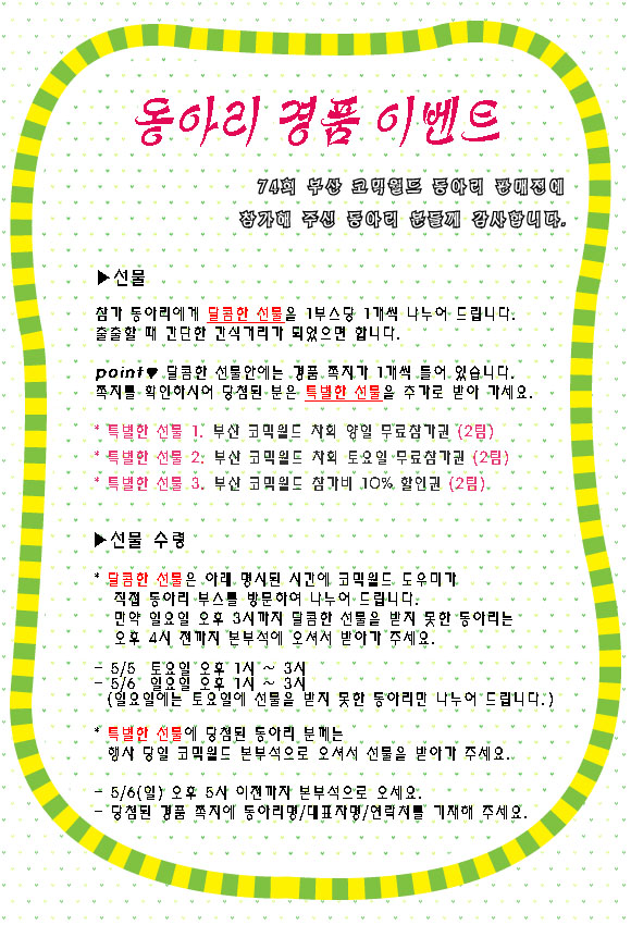 목록 74회 부산 코믹월드 - 참가 동아리 경품 이벤트(5월) 페이지 정보 작성자 코믹월드 댓글 0건 조회 1,992회 작성일 12.04.09 본문 * 참가해 주신 동아리 분들께 감사합니다. 행사정보 코믹월드 문구전