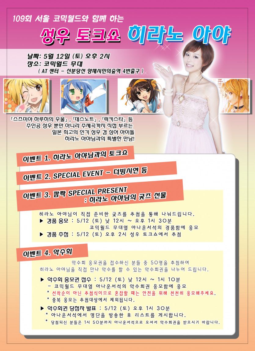 목록 109회 서울 코믹월드- 성우토크쇼 히라노 아야 [이벤트 일정] 페이지 정보 작성자 코믹월드 댓글 0건 조회 3,493회 작성일 12.04.13 본문 * 여러분의 많은 관심 부탁드립니다. 행사정보 코믹월드 문구전