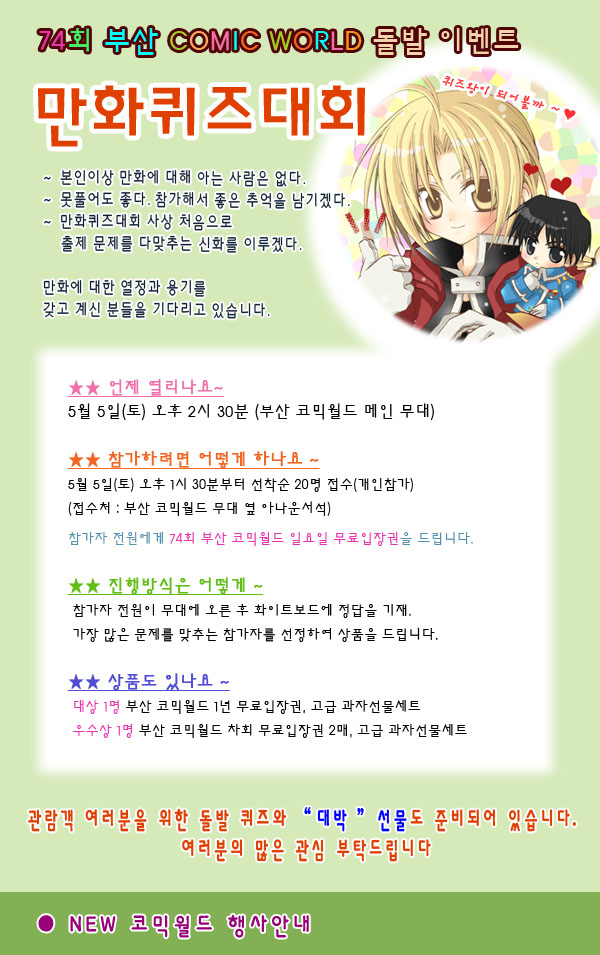 목록 74회 부산 코믹월드 - 만화퀴즈대회 (5/5 토 2시반) 페이지 정보 작성자 코믹월드 댓글 0건 조회 2,039회 작성일 12.04.26 본문 74회 부산 코믹월드 - 만화퀴즈대회 (5/5 토 2시반) 행사정보 코믹월드 문구전