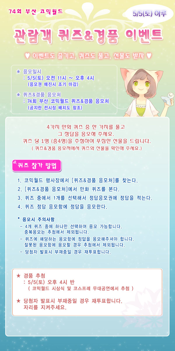 목록 74회 부산 코믹월드 관람객 퀴즈&경품 이벤트(5/5 토) 페이지 정보 작성자 코믹월드 댓글 0건 조회 2,268회 작성일 12.05.02 본문 * 많은 관심과 참여 부탁드립니다. 행사정보 코믹월드 문구전