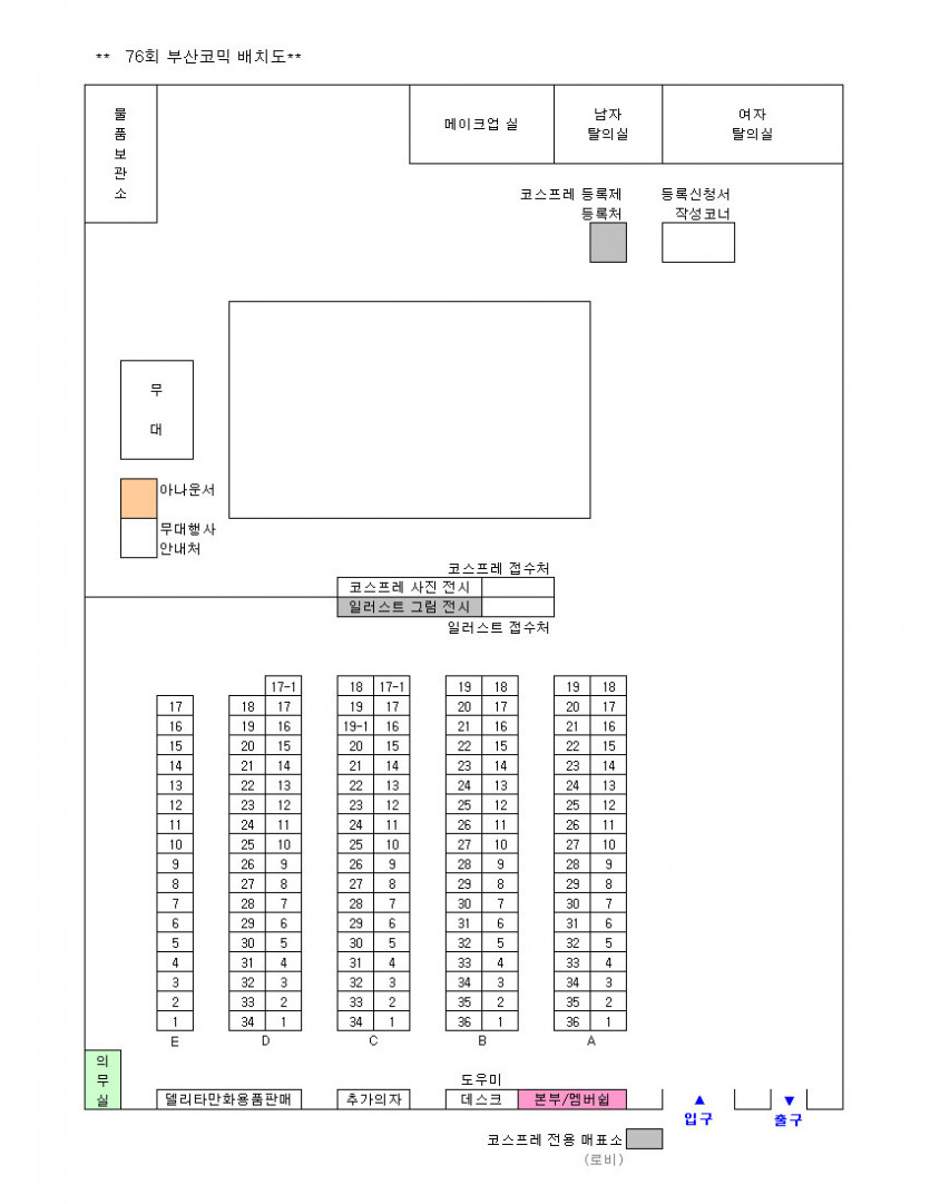목록 76회 부산 코믹월드 전시장 배치도(8월) 페이지 정보 작성자 코믹월드 댓글 0건 조회 1,933회 작성일 12.08.13 본문 ※ 76회 부산 코믹월드 전시장 배치도(8월) 아래 그림을 클릭하면 좀 더 정확하게 전시장 배치도를 볼 수 있습니다. 행사정보 코믹월드 문구전