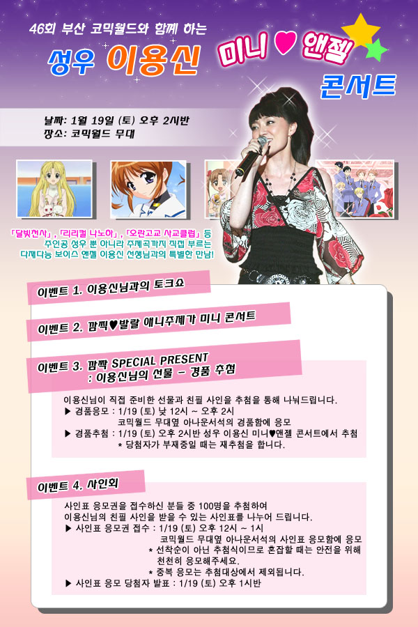 목록 46회 부산 코믹월드 - 성우 이용신 미니 엔젤 콘서트(세부일정) 페이지 정보 작성자 코믹월드 댓글 0건 조회 3,416회 작성일 08.01.10 본문 행사정보 코믹월드 문구전