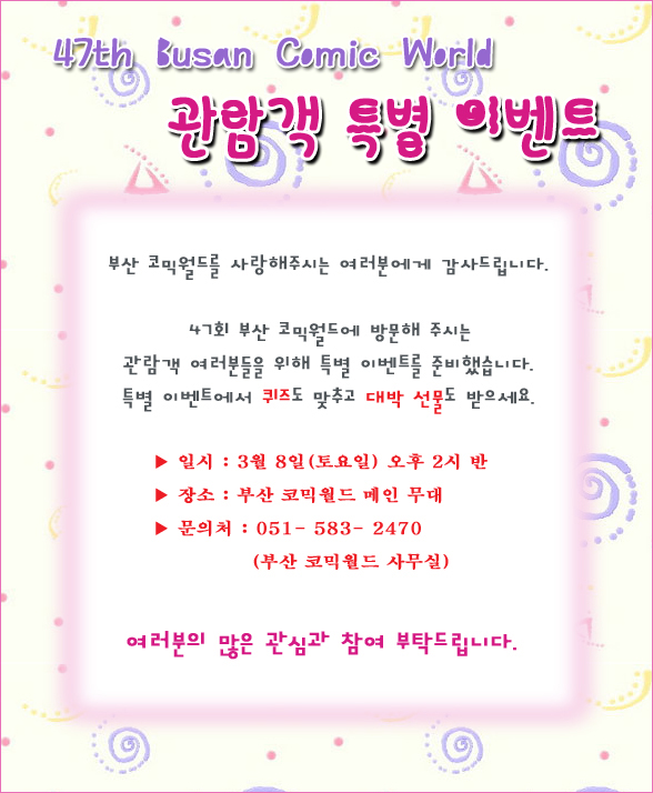 목록 47회 부산 코믹월드 - 관람객 특별 이벤트 페이지 정보 작성자 코믹월드 댓글 0건 조회 2,563회 작성일 08.03.06 본문 [이 게시물은 코믹월드님에 의해 2008-03-06 11:11:22 이벤트 공지에서 복사 됨] 행사정보 코믹월드 문구전