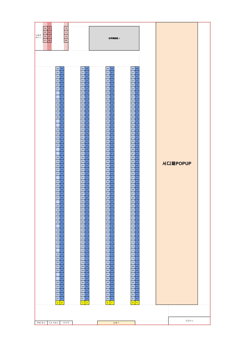 A05 A06 양일 4825% E12 양일 3232 D45 양일 .・゜-: ✧ :- 잡덕들의 향현 -: ✧ :-゜・. B03 B04 양일 *Cherry Blossom* F43 F44 양일 ++Behind Story++ D14 양일 +KIMGYURI F10 양일 ~마법소녀의 모든 것~ H21 양일 ◑고양이구름◑ B11 B12 양일 ★제복X소녀 H23 양일 ★토리냥★ D24 양일 ★할리킹☆ A01 A02 양일 ★playback★ E49 양일 ☆★강한부스★☆ H55 토요일 ♥미정아 생일 축하한다♥ C05 C06 양일 ⭐️ 피카츄환상의응꼬쇼⭐️ D11 양일 1.5일 인간 H53 일요일 25시, 레헬른에서 H16 H17 양일 2D마라탕 H56 토요일 3D입체만화연구회 D36 양일 가가로트 H45 일요일 가자! 포켓몬 세계로! H26 일요일 감자캐는락커들 D38 양일 같이 오타쿠가 되자! H43 토요일 가Zㅏ ○○로 I01 I02 양일 개성인쥬스 H08 양일 경거만동 E06 양일 경주귀살회 G45 G46 양일 고독한미식가 G21 양일 고양이댁네+silverforest B57 B58 양일 고양이발자국 H32 토요일 곰구미 상점 C21 C22 양일 공주님들! 굿즈 챙기실게요! H40 일요일 관리자님 퇴사할게요! E21 양일 굉장해! 엄청나! D48 양일 구멍가게 A23 양일 굿즈상점 B07 B08 양일 굿즈의 세카이 E11 양일 굿즈팔이 소녀들 D57 양일 귀멸과 원피스가 한곳에! F16 양일 귤맛쿠키왕국 H52 일요일 그래서 어디 재학생이신데요? H09 양일 그림마당 D25 양일 그림얼 H34 일요일 근상전 G26 G27 양일 깽이는 언제나 룰루랄라~! G32 G33 양일 나나베어 A41 A42 양일 나비저택 E19 양일 난 하나만 팝니다 F18 양일 날장 H14 양일 내손목돌려줘요 H50 토요일 내인격은다섯개 F15 양일 냥냥 H48 토요일 네.굿즈 팝니다. E38 양일 네거티브둥지 A28 양일 네모행성 1nsa호점 D37 양일 네버모어 G04 G05 양일 네코마마 E51 양일 넬이네 집 F39 F40 양일 녹녹치 않네 G34 양일 누물관 F52 F53 양일 니코코 H35 토요일 닌자라도 사랑이 하고 싶어 H47 일요일 님만오면스쿼드 B31 B32 양일 님파 공작소 C39 C40 양일 다 못 팔면 집에 못 가요... D49 양일 다리 아프신 거 다 알아요 H37 토요일 다못팔면집에못가염 F31 양일 다이아가 없어 F20 양일 단신팀 H42 일요일 달과오렌지 I07 양일 달러랜드 B45 B46 양일 대략총체적난잡덕 G28 양일 도리도리랜드 C13 C14 양일 도리도리벤벤 E32 양일 도리벤사랑해 G01 양일 도쿄 주술 헌터 D07 D08 양일 도쿄아저씨 D35 양일 도토리숲 A36 양일 돈미니 E20 양일 동글동글 H20 양일 두근두근 L사생활 B19 B20 양일 두두월드 H47 토요일 둥지의 부스 G49 양일 들토끼 H24 H25 일요일 디비지는 곽형제 D53 양일 디스코드라이브 B29 B30 양일 디저트 캔디 D39 양일 딸기된장국 E40 양일 딸기맛감자칩 H38 일요일 딸기케이크 C11 C12 양일 또롱별 E55 양일 라피스 H12 양일 람쥐공방 H41 토요일 랩하는 현자님 E18 양일 러블리 토끼슈 A29 양일 레몬벨벳 H49 일요일 레비아탄 사랑해 D15 양일 로아로 G58 양일 롬다롬다롬 A39 A40 양일 루나리아ML H24 토요일 루카팡 D51 양일 룽지 Cafe C35 C36 양일 리둥채난의 잡화점 B49 B50 양일 리본 H51 일요일 마고의 래빗홀 A21 A22 양일 마나에리어 G25 양일 마라탕 E26 양일 많이 진심인 편 E58 양일 말의제작소 A47 토요일 망또 I10 양일 매운맛 Iro C43 C44 양일 매화꽃 A26 양일 먀냐 C55 C56 양일 머리머리해 E33 양일 메론소다 D55 양일 메이플진흥회 C15 C16 양일 메인쿤 D28 양일 멸치국수 D44 양일 명랑개그북 F33 양일 모노가타리 F12 양일 목숨걸고달림 H36 일요일 목표는 완판, 그것 하나뿐이야 D13 양일 무도가심 프로듀서 F05 양일 무언가의 데코라 B39 B40 양일 문어구이 G13 G14 양일 문K D52 양일 므앙므앙 A24 양일 미학제작소 G31 양일 민트초코 F19 양일 바니×4 당근×2 E03 양일 바밤바 D01 D02 양일 백신 F21 양일 백지 E35 양일 버튜버 아시는구나! E56 양일 버튜버 회지 부스 F04 양일 벼리 F02 양일 보물상 F45 양일 봄날 G09 양일 비가내린뒤방과후 G07 G08 양일 비엔나처럼 H27 토요일 빨간머리가 끌리는 이유 H35 일요일 뿌세카 E04 양일 사다하루vs옥견 H33 일요일 사무전 홍보부 B25 B26 양일 사약제당 G50 G51 양일 삼겹숙주볶음 G52 양일 삼겹숙주볶음2 F41 F42 양일 삼단점프 H33 토요일 삼덕쿠키 G03 양일 삼색호랑이 H34 토요일 삼이공이팔 D12 양일 생선구이 H46 토요일 샤브샤브 F23 양일 샴푸의 요정 C47 C48 양일 서코 프리 근데 취해~ G47 양일 서코도 좋죠 D26 양일 선진테크윈 H11 양일 선택적야행성 F38 양일 설레아 C23 C24 양일 세계 몬무스 협회 한국지부 I03 양일 세렝게티 A32 A33 양일 세오사비 F13 양일 세카이즈 F27 양일 솜공방 I06 양일 순경애주 함 잡숴봐 A34 A35 양일 순수한불순물 G35 G36 양일 스노우볼 E52 양일 스타드롭 I12 일요일 스텔라 총공기원 부스 D23 양일 시나몬롤 A30 A31 양일 시노사비 E14 양일 시무룩한 브로콜리 F01 양일 시작은 마이키부터 E28 양일 시즈오카 G15 G16 양일 시크릿 A46 양일 신클럽 F37 양일 심해생활백서 A43 양일 십이귀월 F25 양일 아랫빵주 F22 양일 아스가르드 B27 B28 양일 아쿠아이로 H37 일요일 안 사면 쏜다! 도만 피스톨즈 H26 토요일 안녕,세화씨 H44 일요일 안산브루 스타즈 고! B43 B44 양일 알고리즘 C57 C58 양일 암울한 오타쿠의 소리침 H36 토요일 애정장르는 많지만 덕질장르는 없어 E43 양일 애페 F06 양일 앨리스와차 D42 양일 양키 꿉는 빵공장 H49 토요일 양키도 자전거를 탈 수 있잖아?! E57 양일 언더테일을 품은 부스 A27 양일 언젠가부스가하고싶