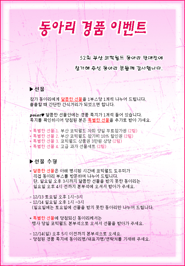 ● 상품 : 참가자 전원에게는 차회 코믹월드 무료 입장권을 선물로 드리며,