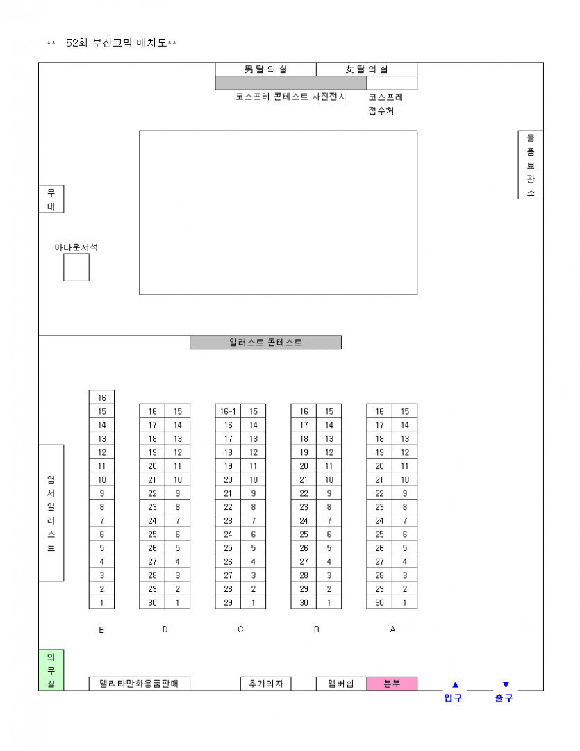 목록 52회 부산 코믹월드 전시장 배치도(12월) 페이지 정보 작성자 코믹월드 댓글 0건 조회 2,883회 작성일 08.12.01 본문 ※ 52회 부산 코믹월드 전시장 배치도 아래 그림을 클릭하면 좀 더 정확하게 전시장 배치도를 볼 수 있습니다. 행사정보 코믹월드 문구전