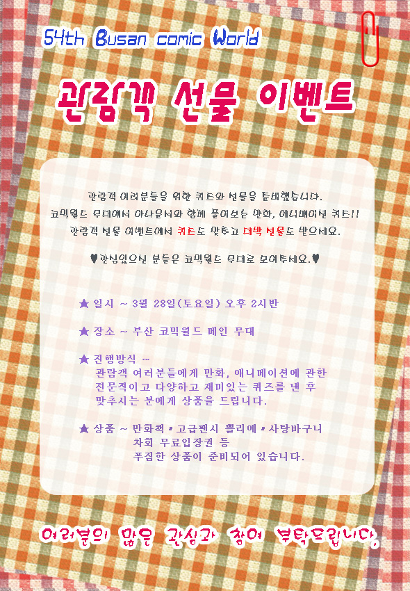 목록 54회 부산 코믹월드 - 관람객 선물 이벤트(3/28 토) 페이지 정보 작성자 코믹월드 댓글 0건 조회 2,315회 작성일 09.03.20 본문 54회 부산 코믹월드 - 관람객 선물 이벤트(3/28 토) 행사정보 코믹월드 문구전