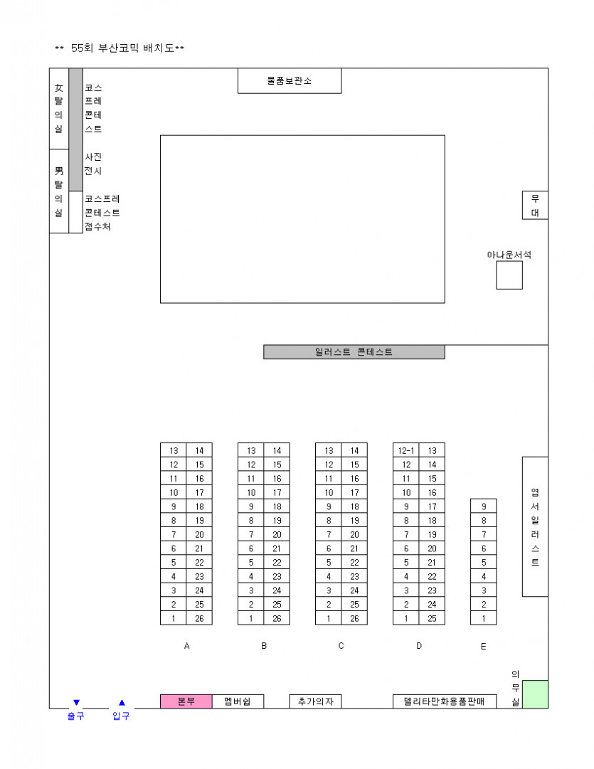 목록 55회 부산 코믹월드 전시장 배치도 페이지 정보 작성자 코믹월드 댓글 0건 조회 2,215회 작성일 09.04.20 본문 ※ 55회 부산 코믹월드 전시장 배치도 아래 그림을 클릭하면 좀 더 정확하게 전시장 배치도를 볼 수 있습니다. 행사정보 코믹월드 문구전