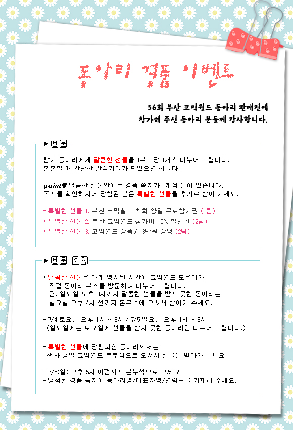 목록 56회 부산 코믹월드 동아리 경품 이벤트(7월) 페이지 정보 작성자 코믹월드 댓글 0건 조회 2,330회 작성일 09.05.15 본문 56회 부산 코믹월드 동아리 경품 이벤트(7월) 행사정보 코믹월드 문구전