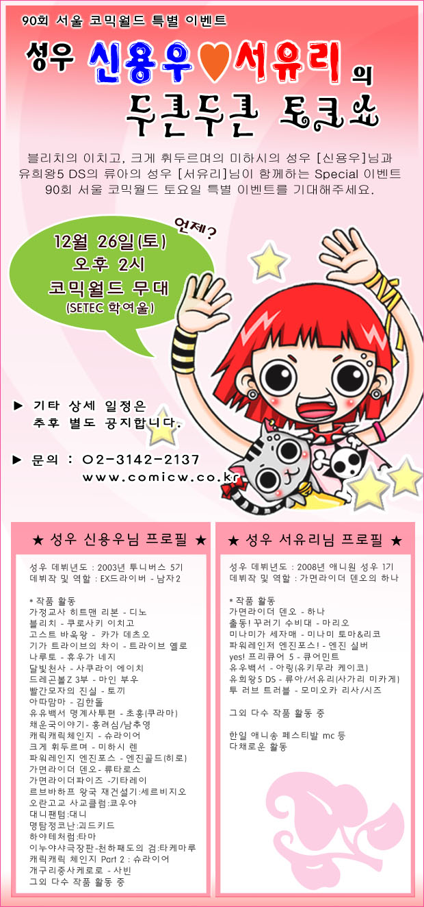 목록 90회 서울 코믹월드 성우 신용우,서유리의 두근두근 토크쇼 페이지 정보 작성자 코믹월드 댓글 0건 조회 2,930회 작성일 09.12.04 본문 여러분의 많은 관심 부탁드립니다.▶ 성우 신용우 님과 서유리님 팬래터와 질문 응모 코너 바로가기 click * 코믹월드님에 의해서 게시물 복사되었습니다 (2009-12-04 17:27) 행사정보 코믹월드 문구전