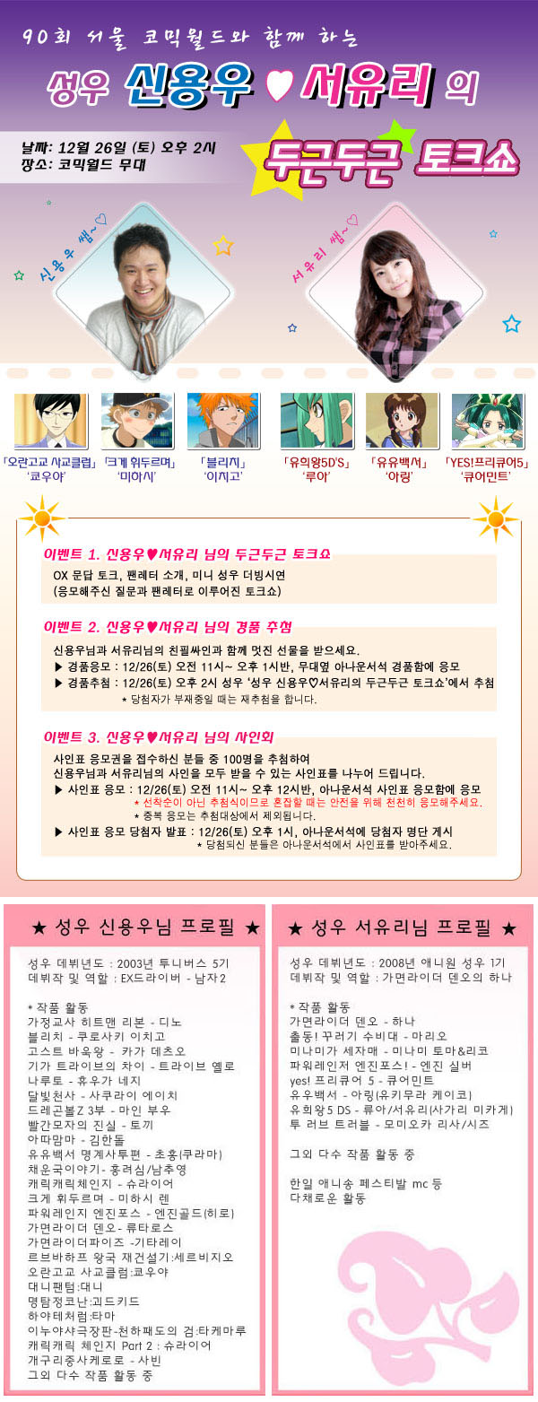 목록 90회 서울 코믹월드 성우신용우,서유리의 두근두근 토크쇼(상세일정) 페이지 정보 작성자 코믹월드 댓글 0건 조회 2,867회 작성일 09.12.18 본문 여러분의 많은 관심과 성원 부탁드립니다. * 코믹월드님에 의해서 게시물 복사되었습니다 (2009-12-18 17:50) 행사정보 코믹월드 문구전