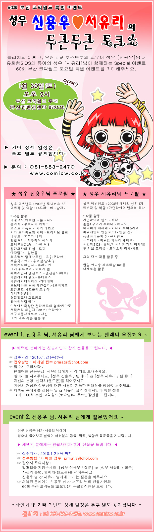 목록 60회 부산 코믹월드-성우 신용우,서유리의 두근두근 토크쇼 페이지 정보 작성자 코믹월드 댓글 0건 조회 3,448회 작성일 10.01.08 본문 많은 관심과 참가 부탁드립니다. 행사정보 코믹월드 문구전